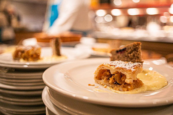 A pranzo e cena propone un buffet con antipasti caldi e freddi, primi, secondi e una selezione di pasticceria. La cucina è di ispirazione mediterranea, con piatti tipici della tradizione trentina.