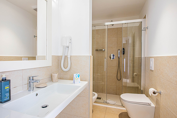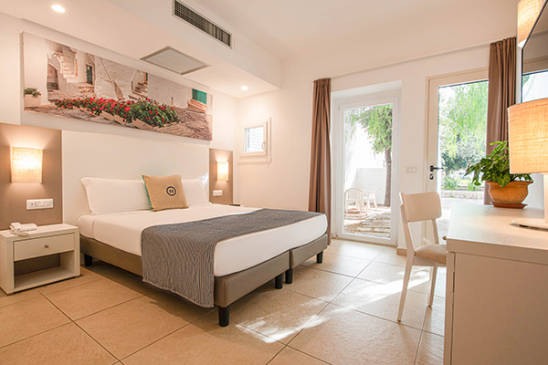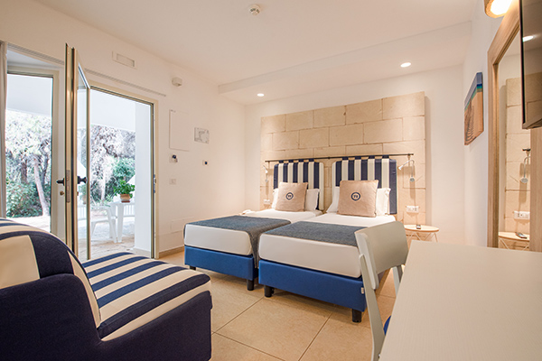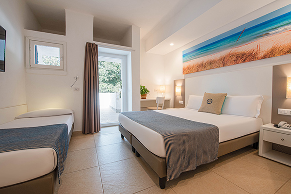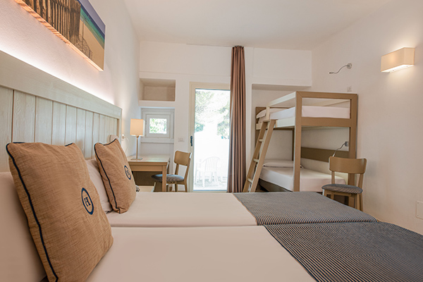 Ideale per quattro persone o famiglie con bambini. La camera recentemente rinnovata e ubicata in una zona più riservata rispetto al corpo centrale, è composta da un unico vano, letto matrimoniale e letto a castello. Tutte dotate di servizi privati, aria condizionata, TV, Wi-Fi, cassetta di sicurezza, frigobar*. Il bagno privato è dotato di doccia o vasca, asciugacapelli e set di prodotti da bagno.